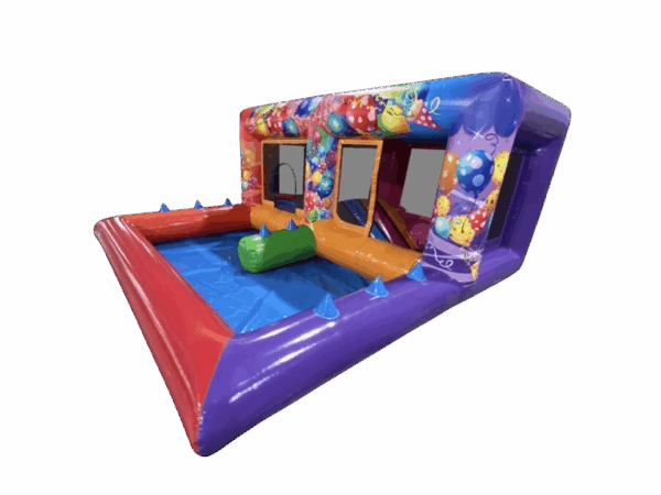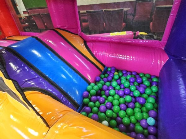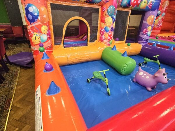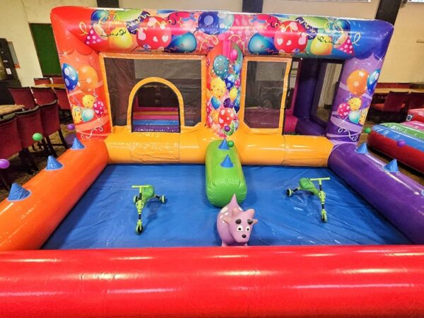 Measuring 13ft wide by 13ft long, this inflatable fits comfortably into most venues, making it ideal for indoor parties, while also being suitable for outdoor events. The Playzone includes a small bouncy castle for jumping and bouncing, a mini slide, a ball pool for imaginative play, and air jugglers that provide fantastic sensory stimulation for younger children.